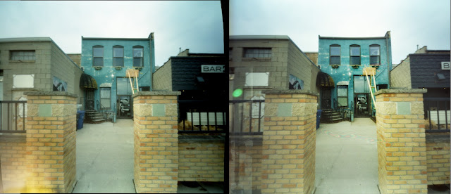 The 30mm Extended Baseline Stereo Populist has hand drilled .25mm pinholes on the axis and 11mm above it. The 90mm Extended Baseline Stereo Populist has .40mm Gilder Electron Microscope Apertures on the axis and 13mm above it. The first roll through both cameras was Kodak Gold 200, the second Lomography 100. Kodaks developed in Arista.edu C-41 liquid kit, Lomos in Cinestill's liquid kit.